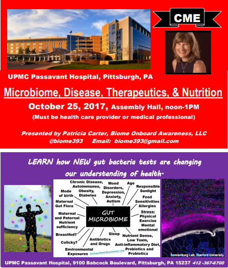 SUMMARY: Microbiome CME!!! If you are a healthcare provider or medical professional, attend this CME Microbiome. Disease, Therapeutics, and Nutrition at UPMC Passavant Hospital, Pittsburgh, October 25, 2017, Assembly Hall, noon–1PM! The new discovery of the microbiome, a 2 to 3 pound organ having a key role in over 70 percent of our immunity, is a paradigm shift changing up our understanding of physiological and psychological health and disease. This CME shares current no–nonsense evidence of what the microbiome is and includes valuable insights into what is overselling the microbiome. Click here for the PDF: CME Microbiome. Disease, Therapeutics, and Nutrition, Oct 25, 2017, UPMC Passavant Hospital. LEARN eye-opening insights and actionable tips about the KEY role the microbiome plays in your organ of choice, in chronic disease (2/3 of deaths in Allegheny County are attributed to chronic disease) including hypertension, heart disease (this leading cause of death, at 30% in Allegheny County, is higher compared to the state of PA), diabetes, metabolic syndrome, obesity, cognition, Alzheimer’s, IBD, IBS, MS, and more, as well as its role in increasing drug efficacy and prevention of medication failures. Listen as local patients share how they use evidence–based microbiome therapeutics to induce and maintain remission for autoimmune disease, and learn about the Pittsburgh—based cohort forming for inclusion in upcoming leading light microbiome researcher, Dr. Rob Knight, UCSF studies looking at ferment consumer gut microbiomes (see bio below). Bottom line — DON’T MISS THIS CME — Healthcare provider, medical professional, AND patient education/awareness of this organ is the “why” that causes patient diet and lifestyle behavior changes that moves them OFF diseasespan. The only way to do better is to know better. —poet Maya Angelou. The point of CME is to try to move the field and do right by our patients. Attend and LEARN the role of this new player in the organ/disease of your choice!
