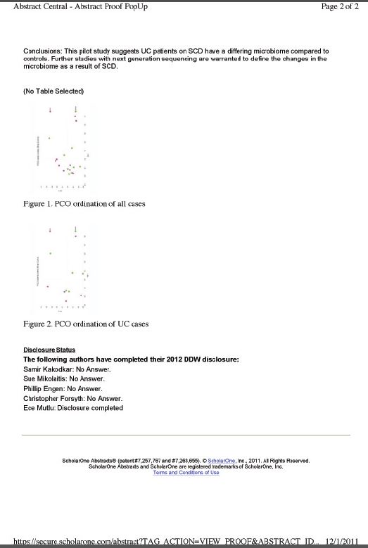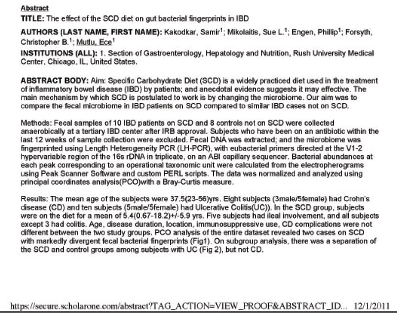 Dr. Ece Mutlu presented this RUSH University Medical Center Study (which can also be read here) showing SCD dieters had greater intestinal bacterial diversity addition to having a differing microbiome composition compared to controls. 20 IBD (10 Crohn’s and 10 UC) patients following the SCD and 20 IBD patients (10 Crohn’s and 10 UC) not adhering to the diet were evaluated. Some patients were receiving immunosuppressant medications. An alternative link, where you can directly read the article is: Rush University Study Shows SCD Diet Encourages Greater Microbiome Biodiversity (self.Paleo). “I have observed that a small number of my own IBD patients drastically improved on the SCD and achieved complete long-term mucosal healing, or were able to reduce or discontinue immunosuppressants for several years. A longitudinal study following IBD patients before the start of the diet, and during and after the SCD, would have been much harder for us to complete, but I think this should be done going forward and it could help us learn a lot more in the future.” The poster abstract presented (and I apologize for the quality of print but it is the best I can do) is: