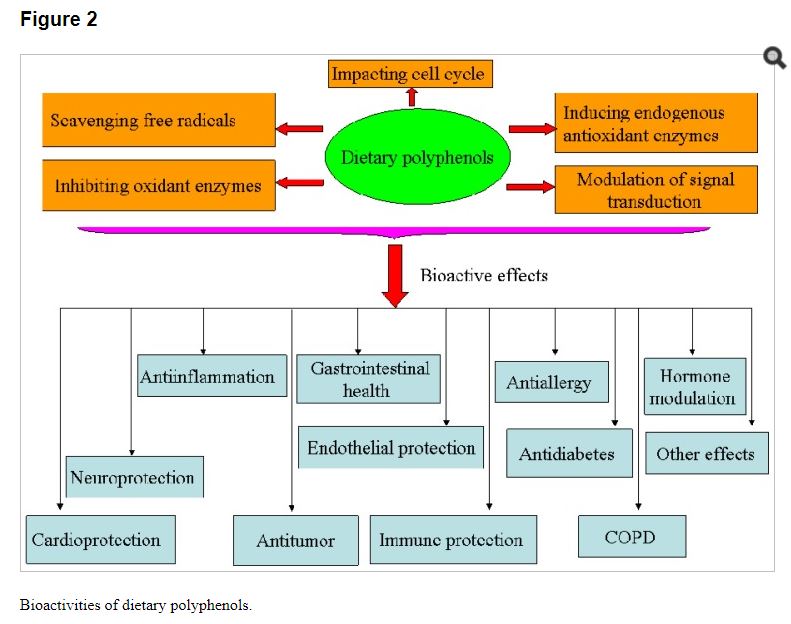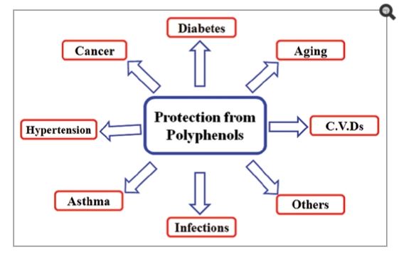 Regarding polyphenols: There are over 8,000 identified polyphenols found in foods such as tea, wine, chocolates, fruits, vegetables, and extra virgin olive oil. [Han et al 2007]  Epidemiological studies and associated meta-analyses strongly suggest that long term consumption of diets rich in plant polyphenols offer some protection against development of cancers, cardiovascular diseases, diabetes, osteoporosis and neurodegenerative diseases , (Fig. 1). [Pandey et al 2009]