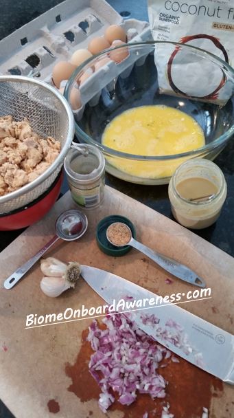 Garlic and onion:  Garlic and onion FODMAPs are not fat soluble therefore you can achieve garlic and onion infusion through the oil.  How?  Saute garlic and onion slices in the hot coconut oil before adding the patties to fry.  Remove the garlic slices prior to frying the patties.   Alternatively, use the green parts of spring onion or chives as a replacement for onion.