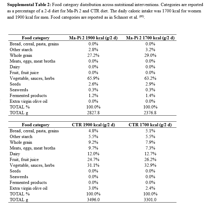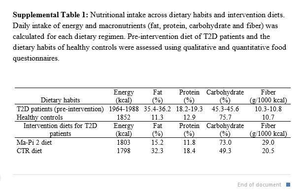 Recall that Ma-Pi 2, but NOT the CTR, counteracted increase of possible pro-inflammatory microbiome species, showing the potential to reverse pro-inflammatory dysbioses in T2D, and possibly explaining the greater efficacy in improving the metabolic control. Ma – Pi 2 does no fruit and therefore would be omitting antioxidants and phenol of berries which are anti-inflammatory. Diet details are from supplemental data materials: